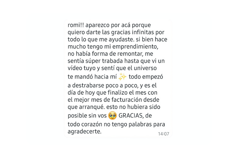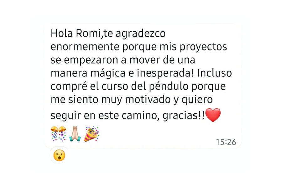 Una vez que adquirís cualquiera de mis cursos, obtenés acceso a un grupo exclusivo de WhatsApp, donde podés hacer todas tus consultas. Allí te acompaño personalmente para que puedas avanzar con total claridad y confianza.